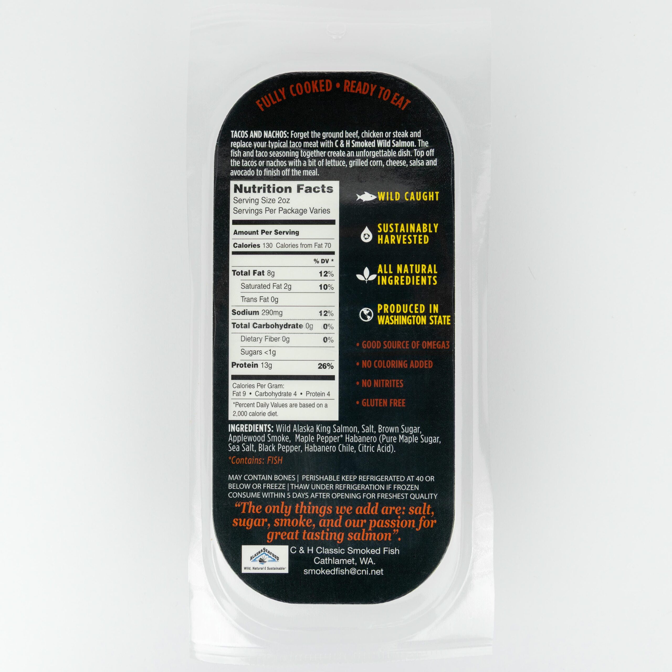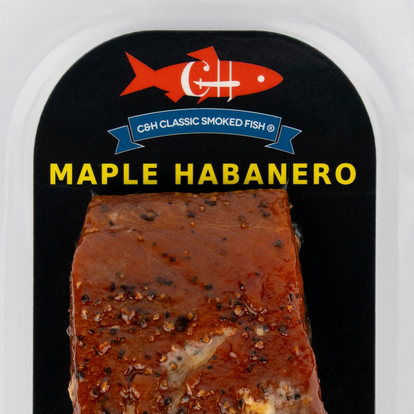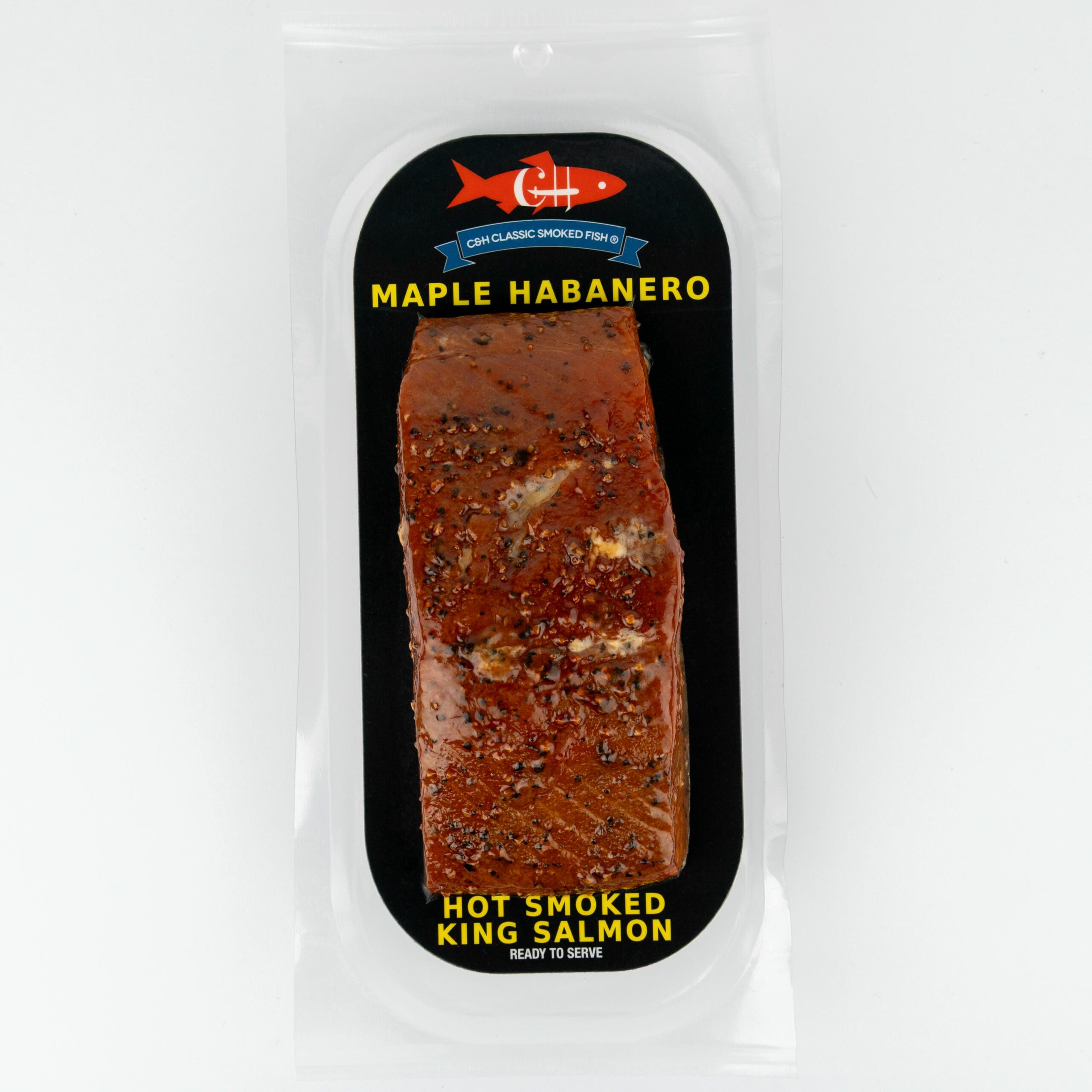 C&H Classic Smoked Fish Smoked King Salmon with Maple Habanero flavor offers a bold and unique combination of sweet and spicy. The rich, tender King Salmon is smoked to perfection, bringing out its natural flavors with a savory smokiness. The maple provides a subtle, sweet undertone that balances the heat from the habanero, which adds a fiery kick. The result is a harmonious blend of sweet, smoky, and spicy notes that makes each bite an exciting experience for your taste buds.