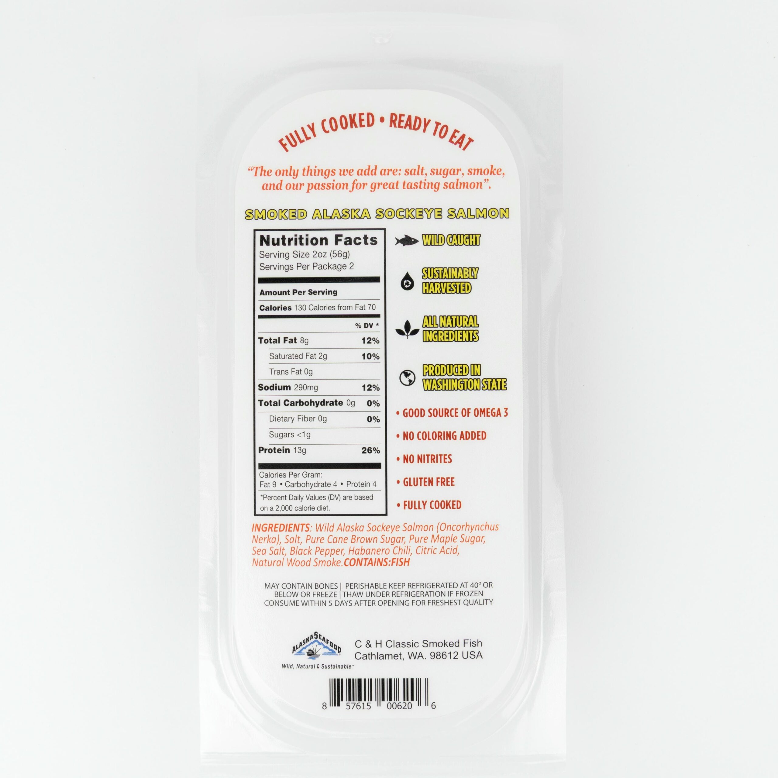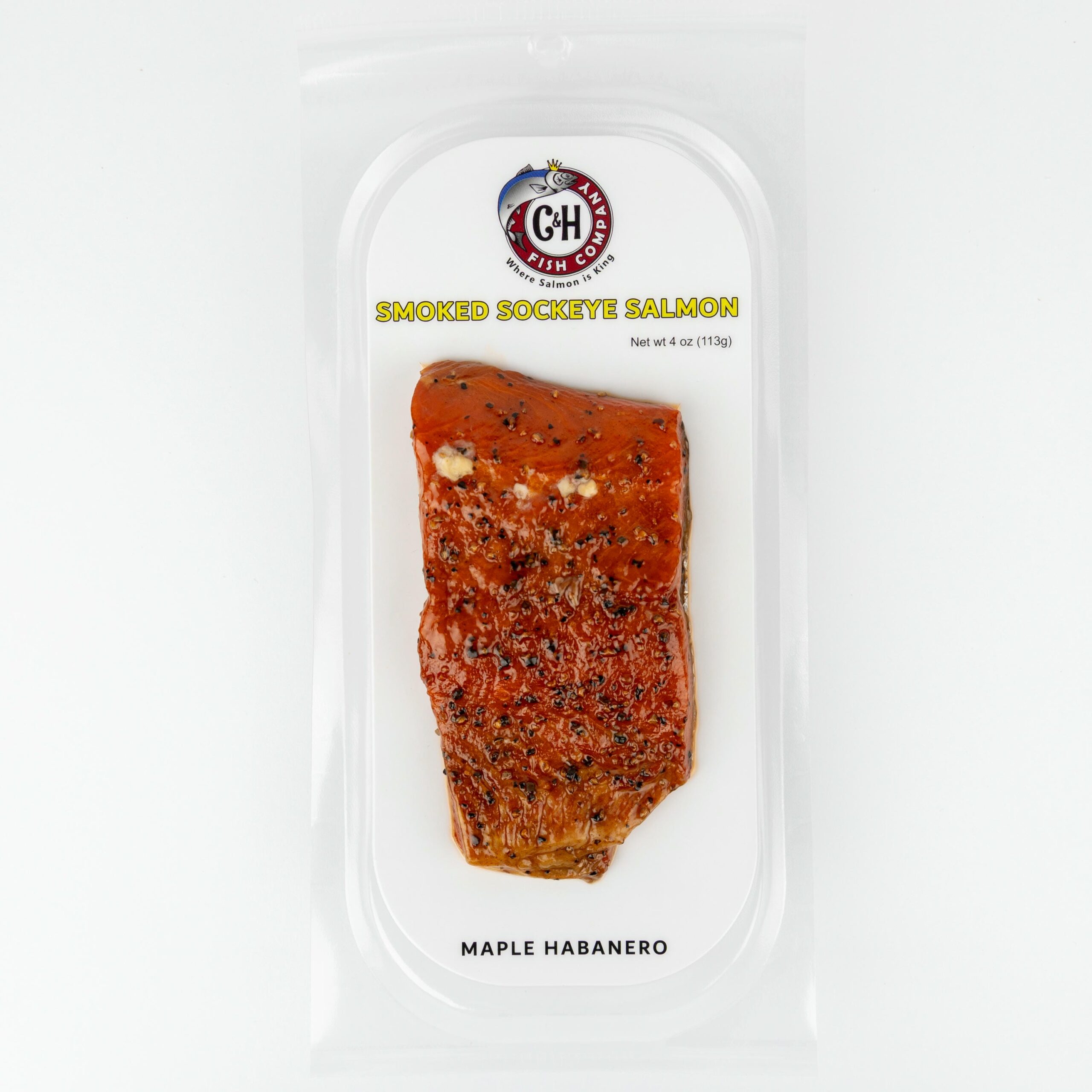 C&H Classic Smoked Fish Smoked Sockeye Salmon Maple Habanero flavor offers a unique and bold twist on traditional smoked salmon. This premium sockeye salmon is carefully smoked to perfection and then infused with a perfect balance of sweet maple and spicy habanero flavors.