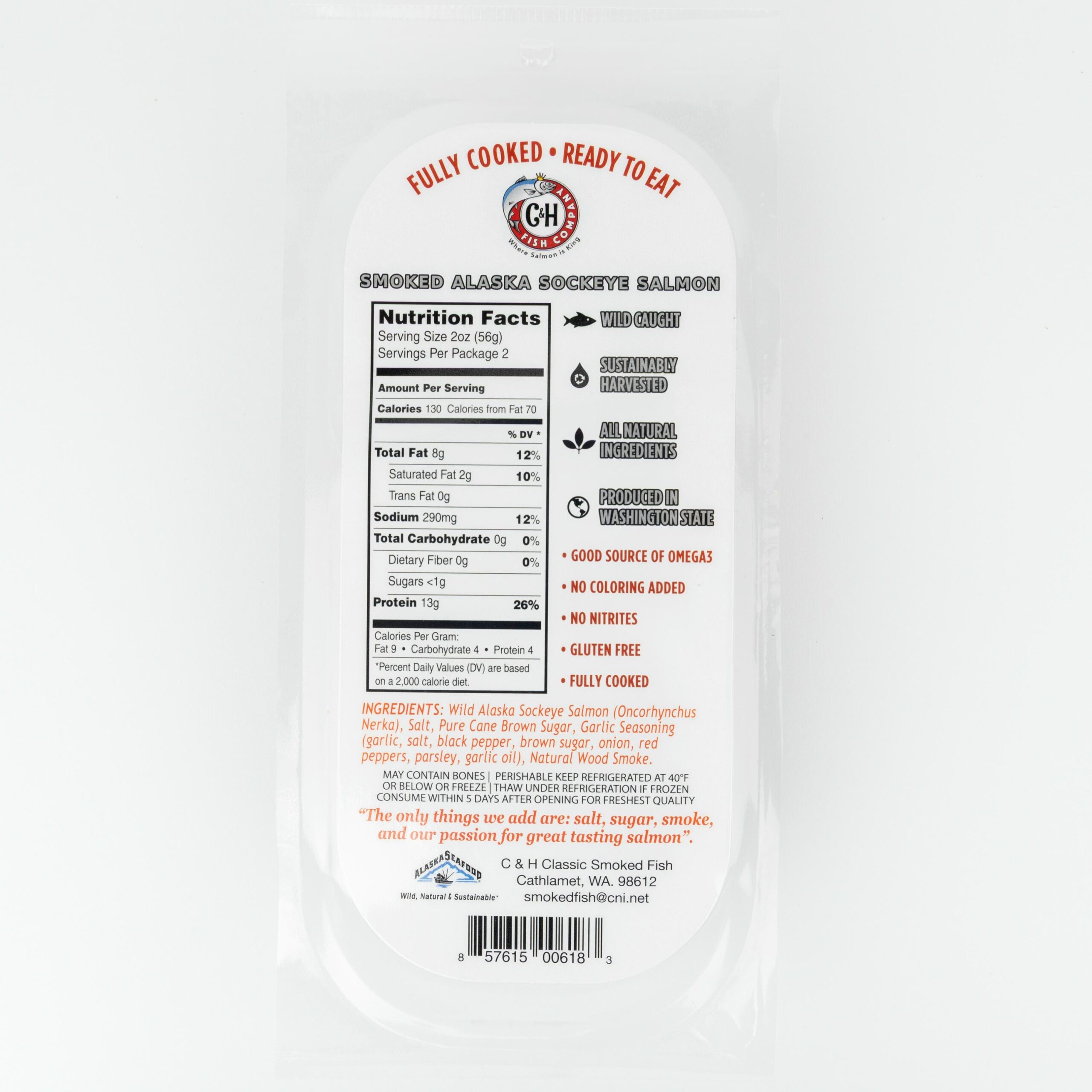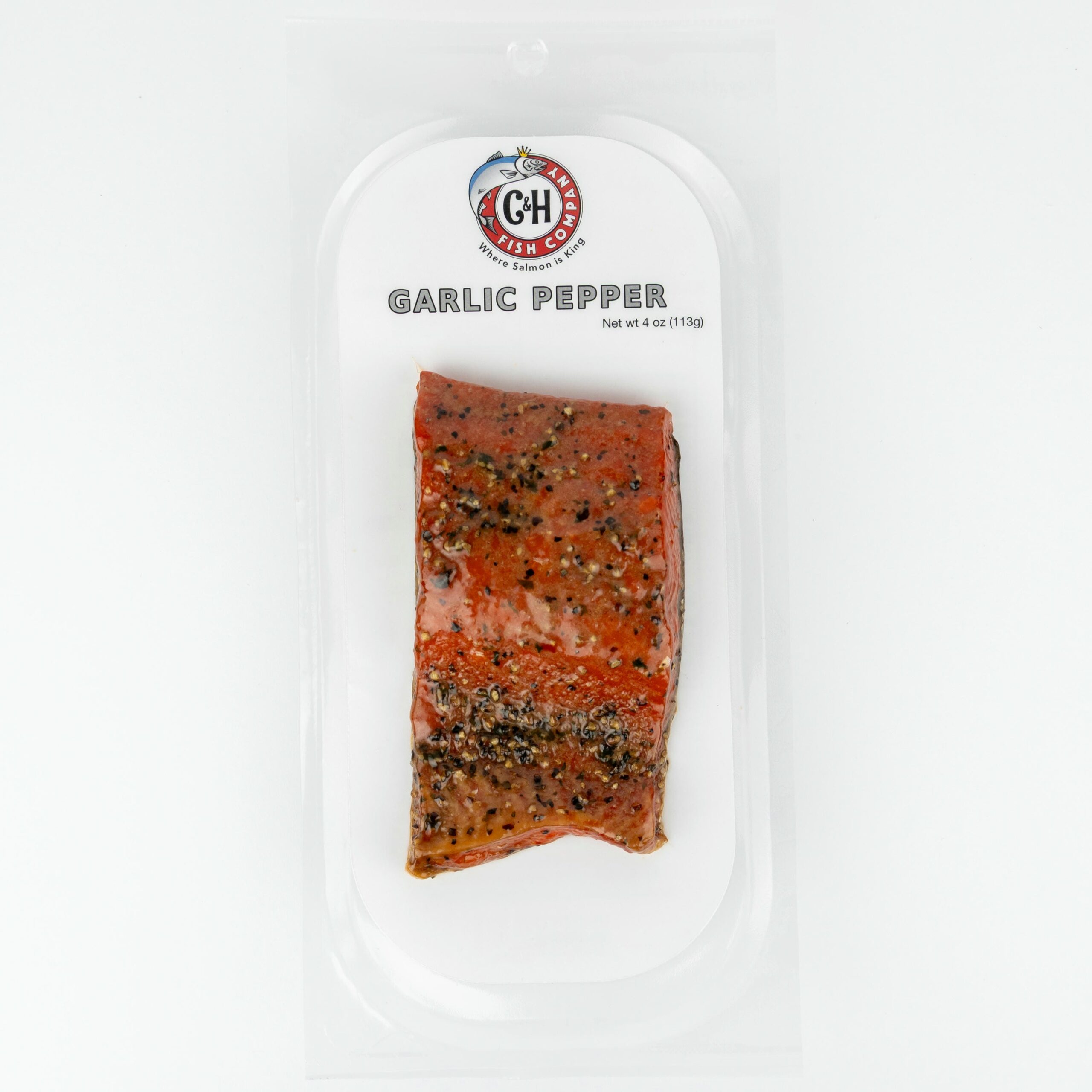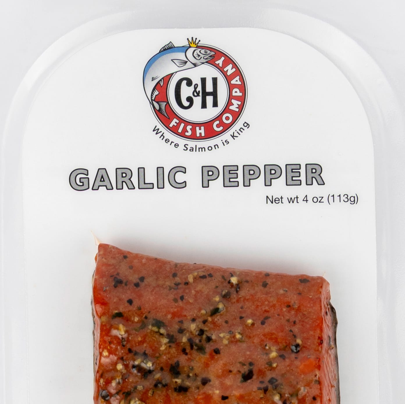 C&H Classic Smoked Fish Smoked Sockeye Salmon with Garlic Pepper flavor delivers a bold and savory experience. The rich, firm texture of the sockeye salmon is expertly smoked, allowing the natural flavors of the fish to shine. The garlic adds a savory depth, infusing the salmon with a mouthwatering richness, while the pepper adds a mild but noticeable kick, giving it a perfect balance of heat and flavor. The smoky notes enhance the overall profile, making each bite a deliciously satisfying combination of smoky, garlicky, and slightly spicy flavors. It’s an ideal choice for those who enjoy a savory, well-seasoned smoked salmon with a touch of heat.